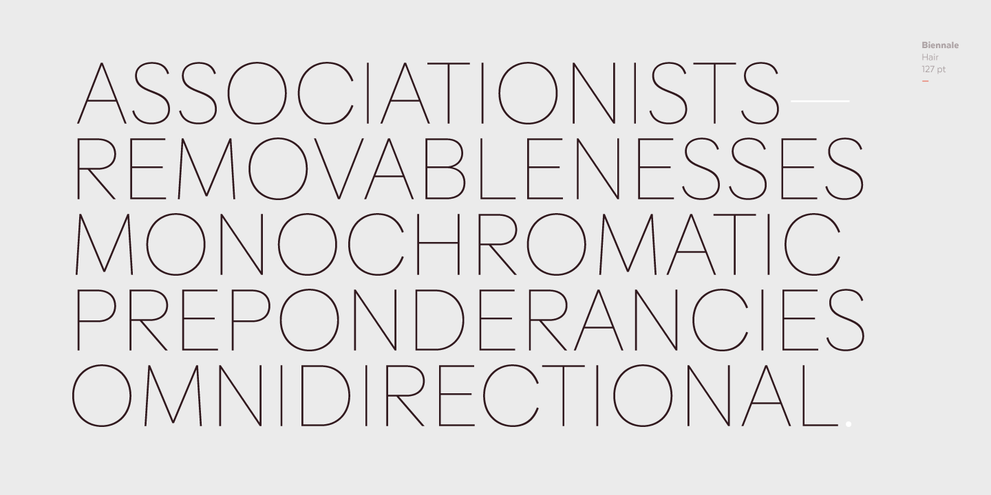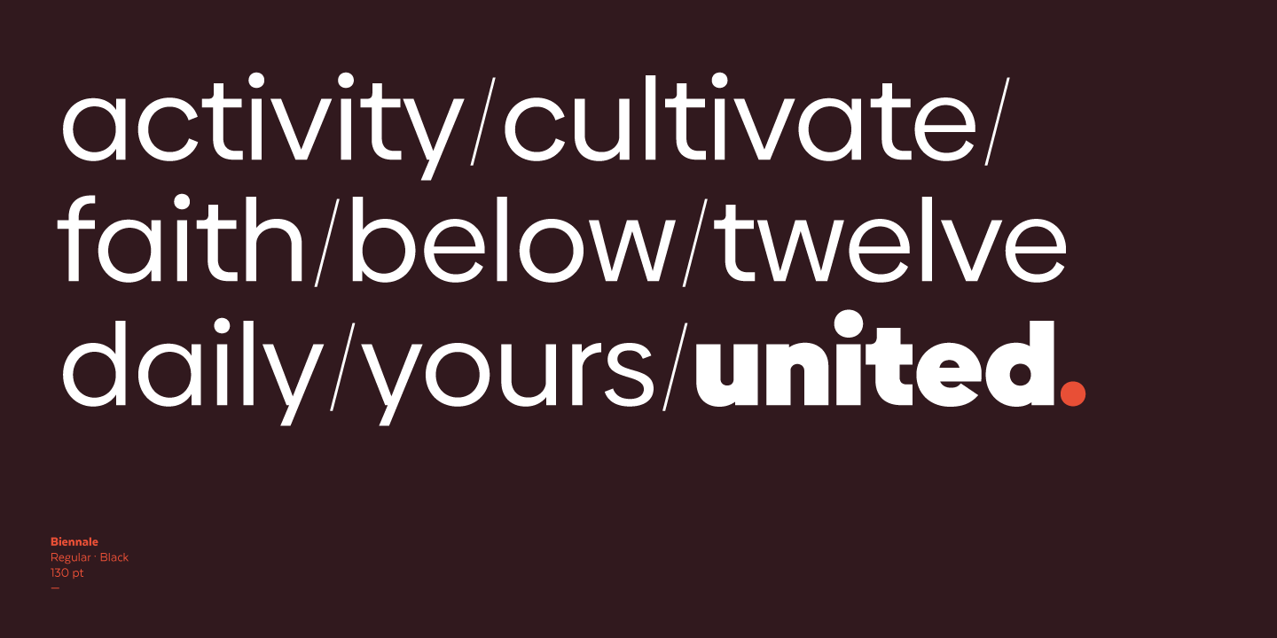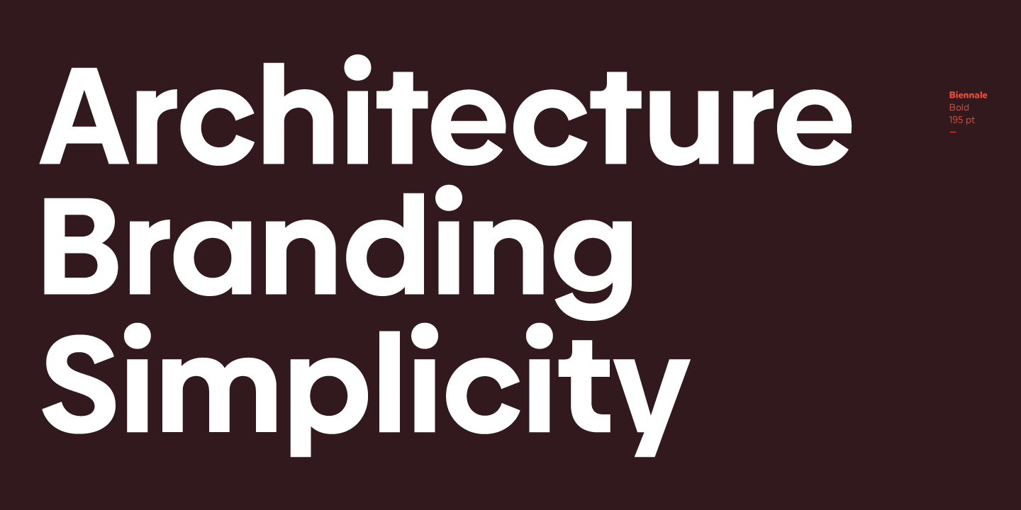 Biennale is a geometric typeface with a strong character and a large x-height which make it an excellent choice for a wide range of applications, such as headlines or branding.