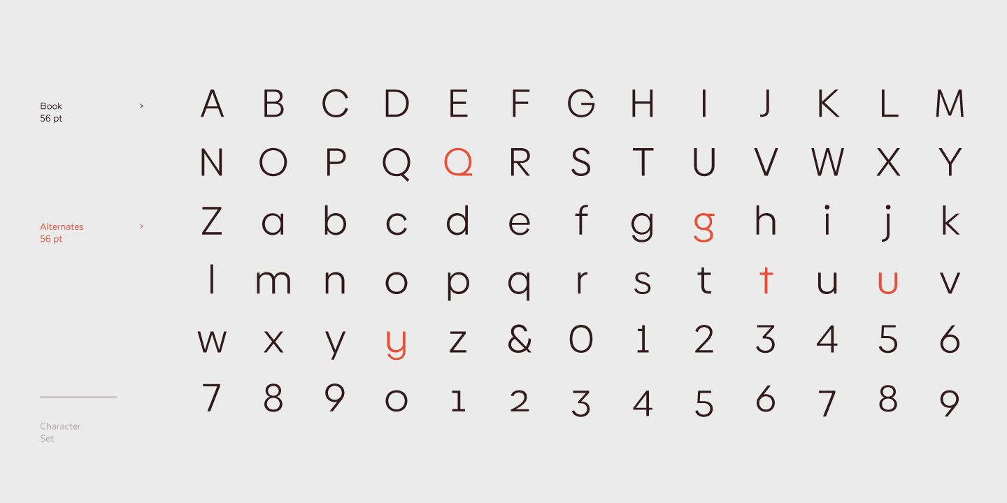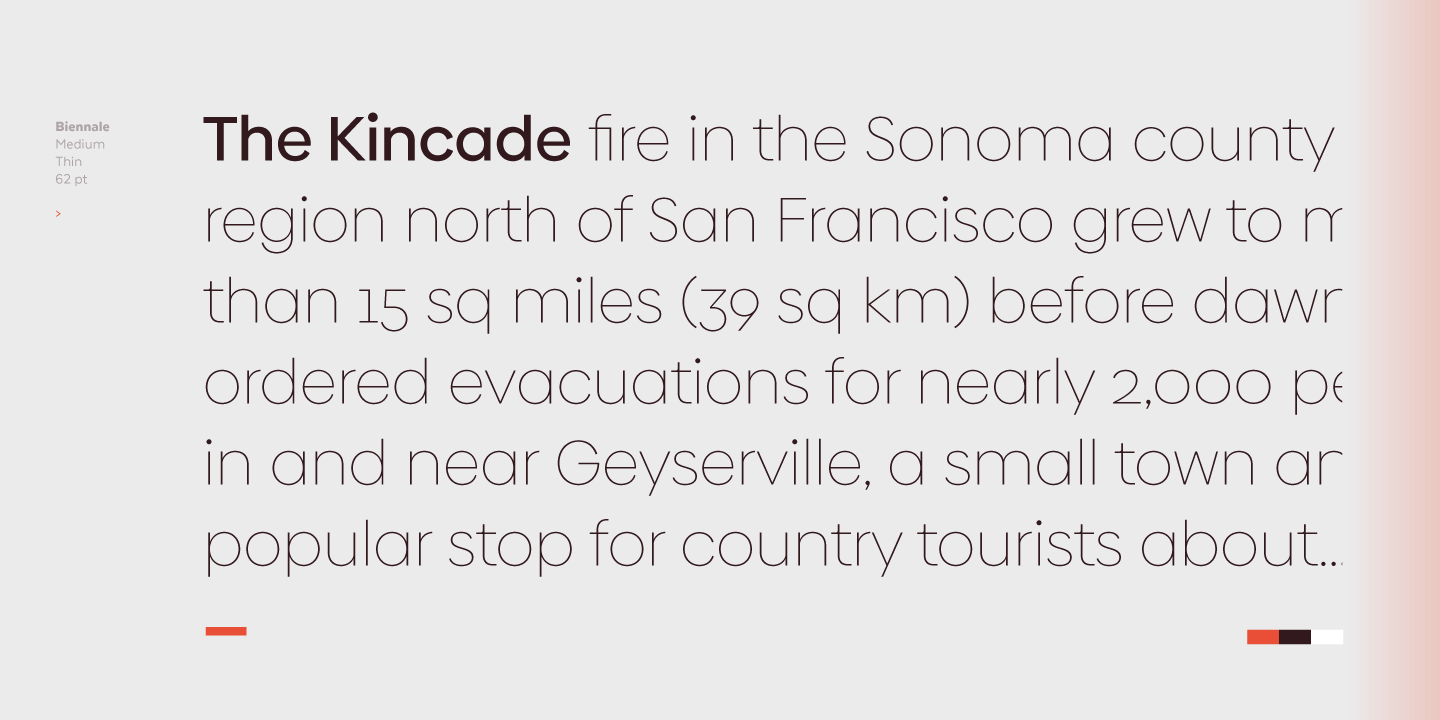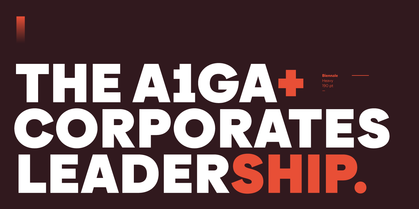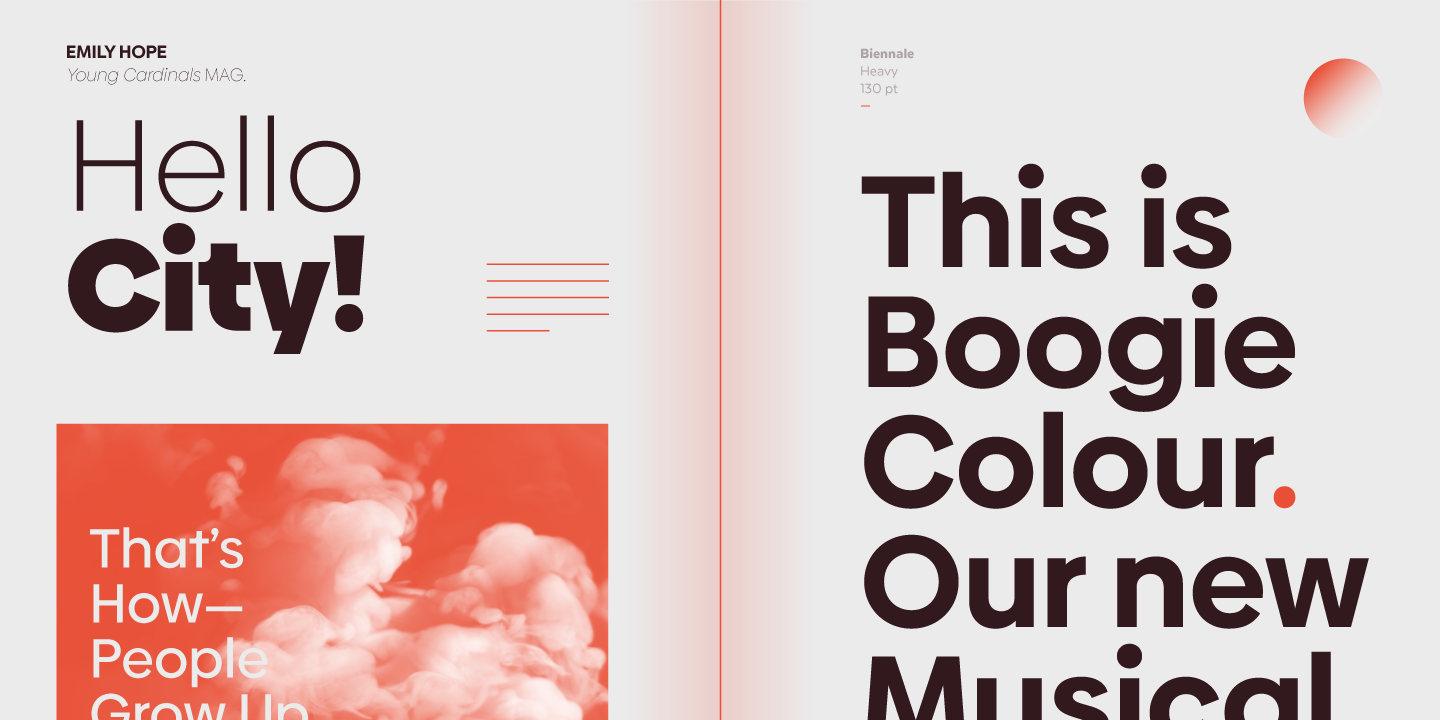 Biennale is a geometric typeface with a strong character and a large x-height which make it an excellent choice for a wide range of applications, such as headlines or branding.
