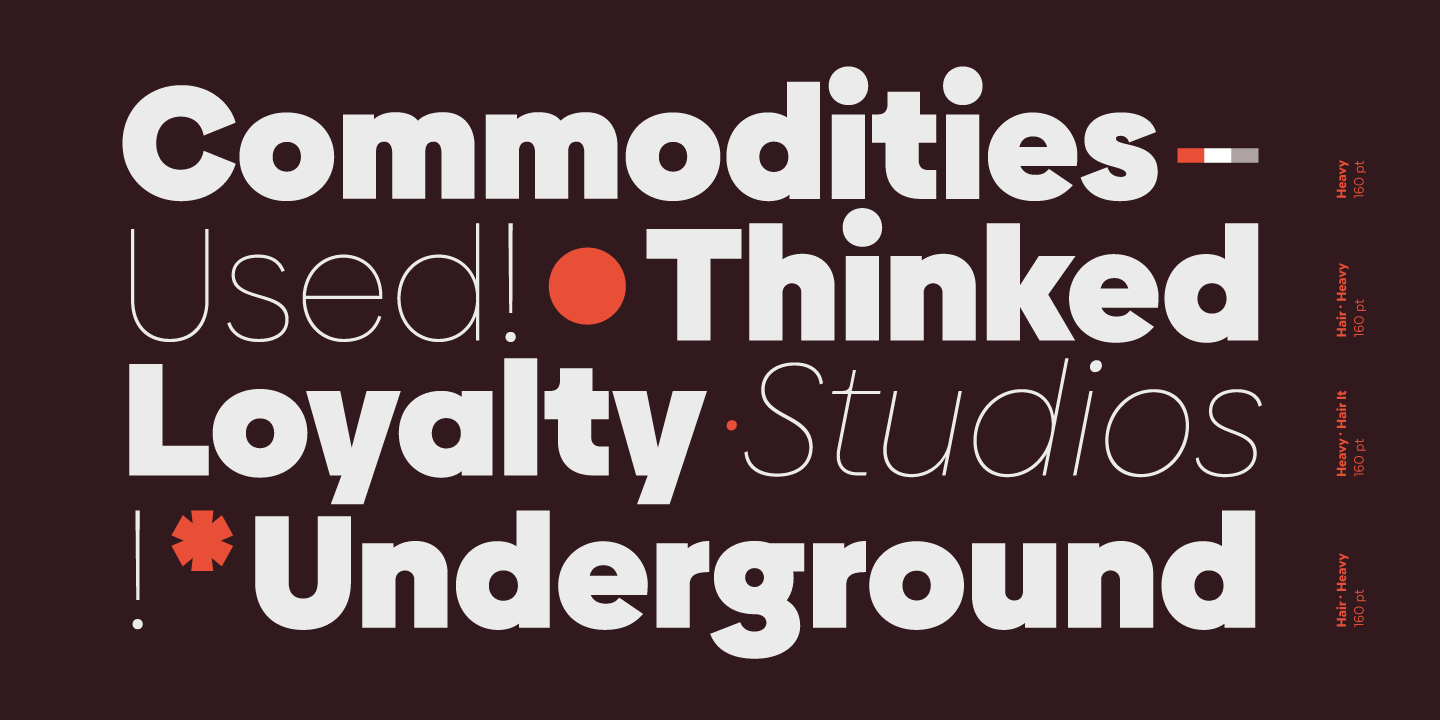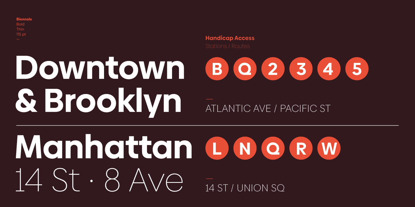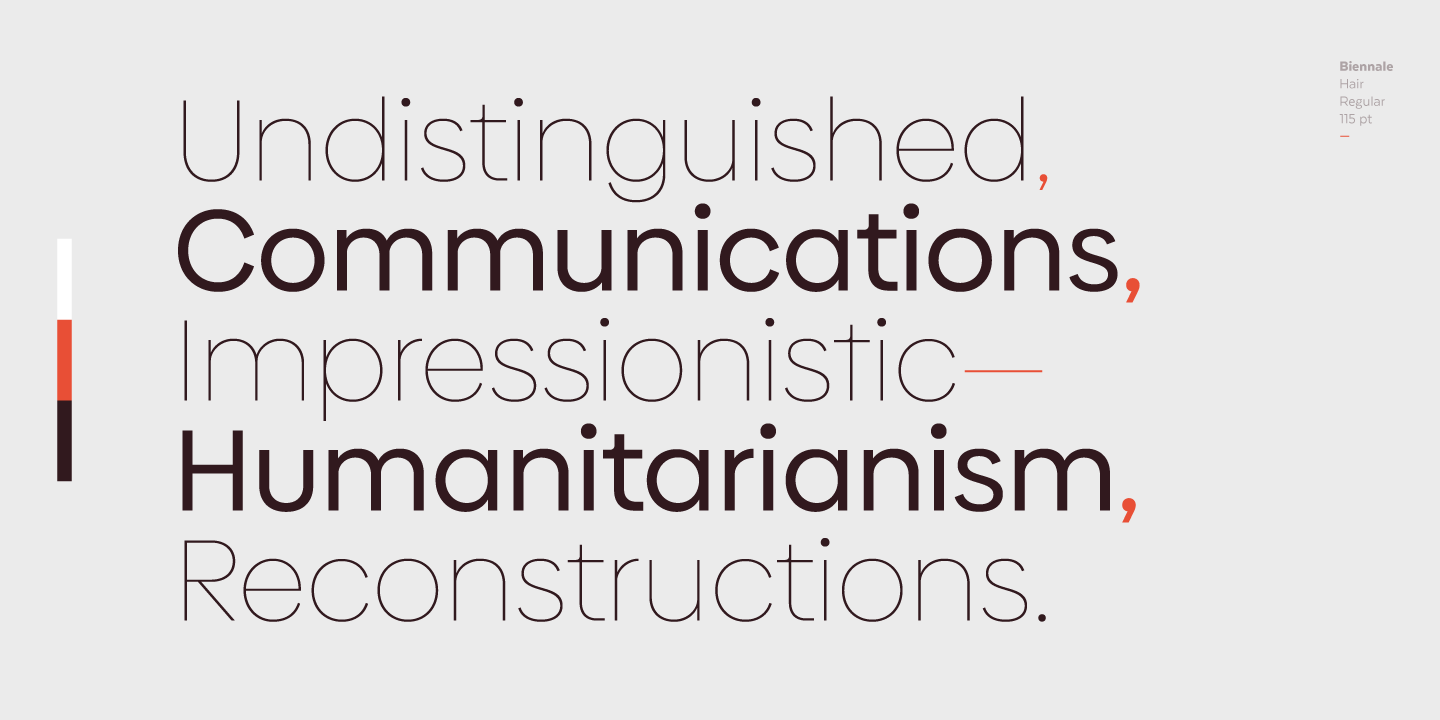 Although common in style, Biennale distinctive details and color on the page allow users to create really unique designs. The font comes in 11 weights, from Hair to Heavy, and includes matching italics.