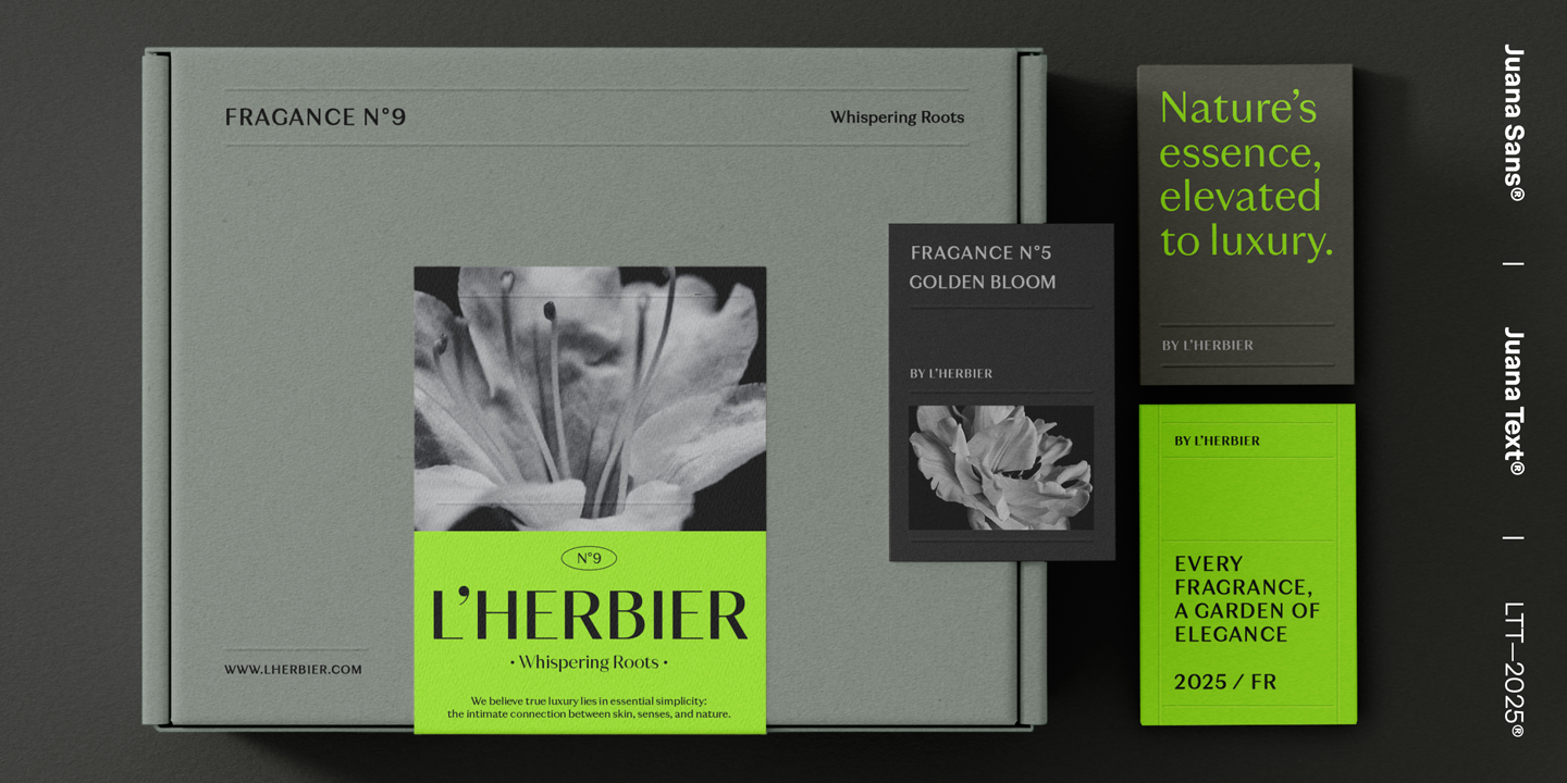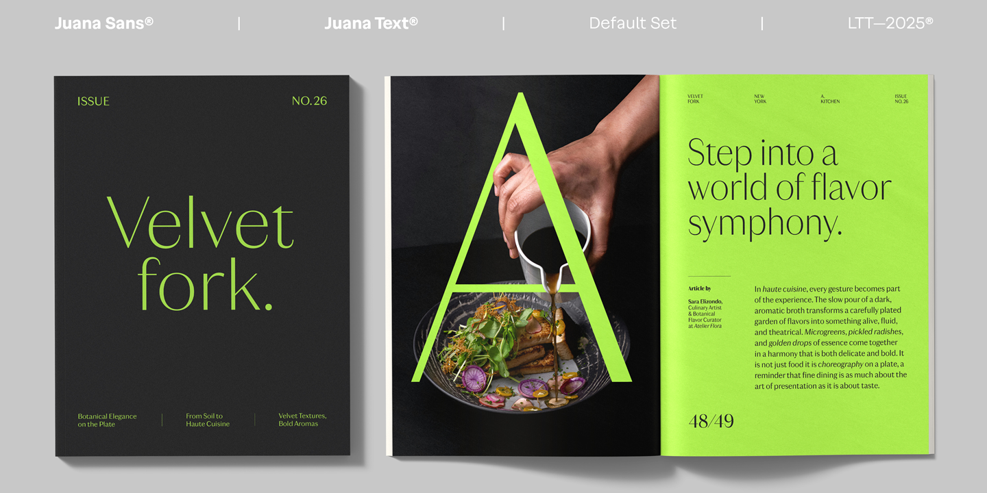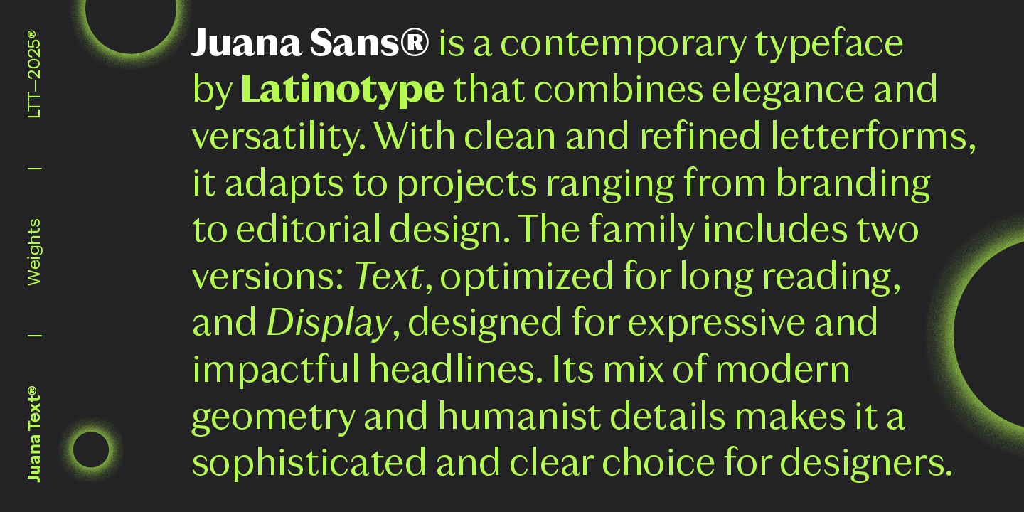 Both versions naturally interact with the original Juana, forming a coherent, versatile, and contemporary typographic system that easily adapts to a wide range of visual communication needs.