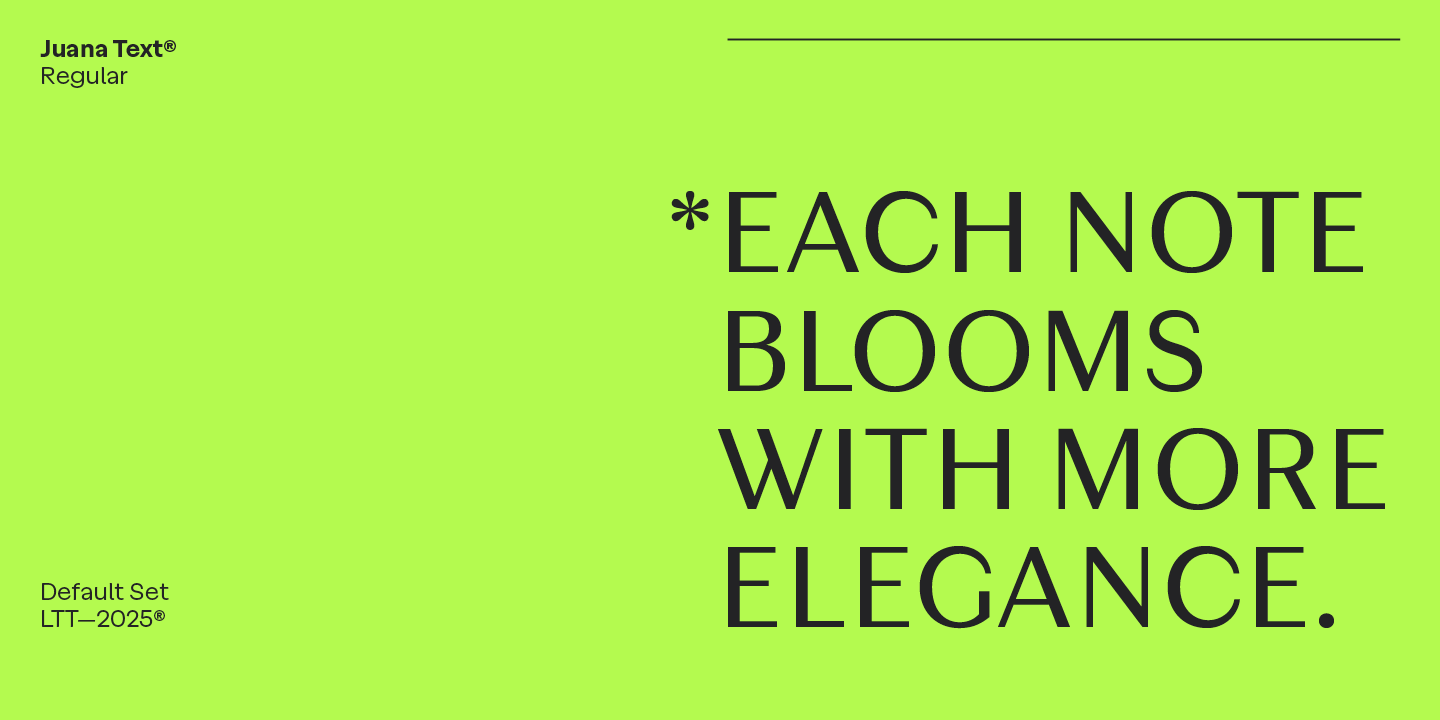Juana Display, with its high contrast and precise curves, is designed for titles and headlines where elegance and visual impact take center stage. Meanwhile, Juana Text softens contrast and reinforces fine strokes to provide smooth, comfortable reading in long paragraphs, while preserving the stylized, editorial character that defines the family.