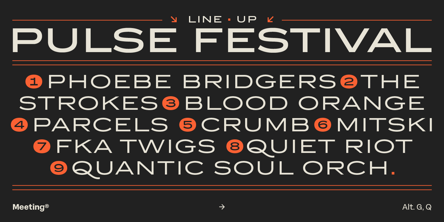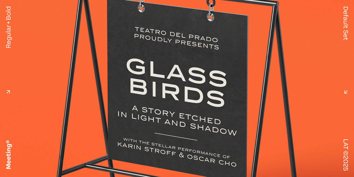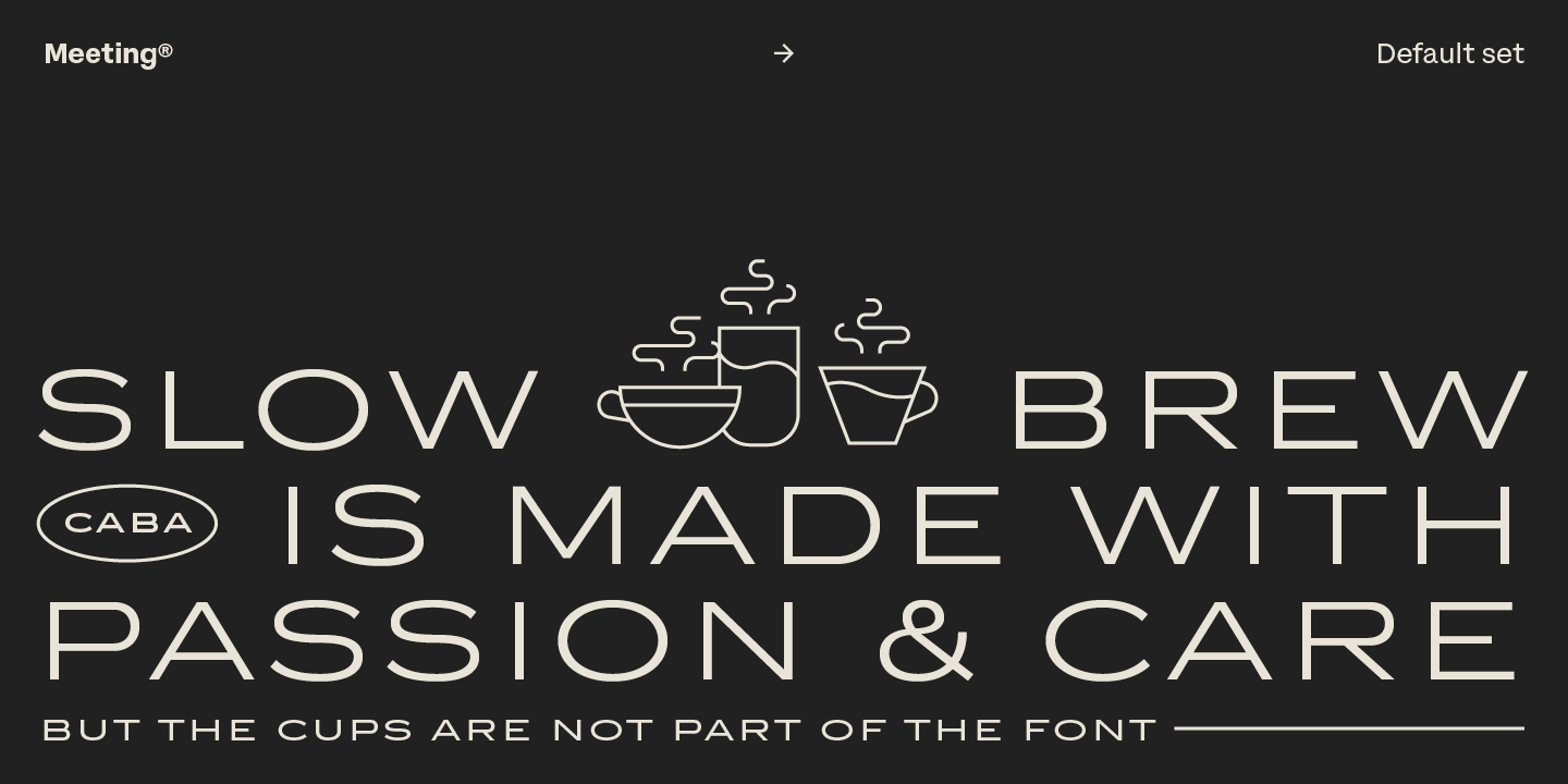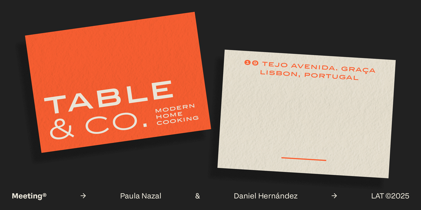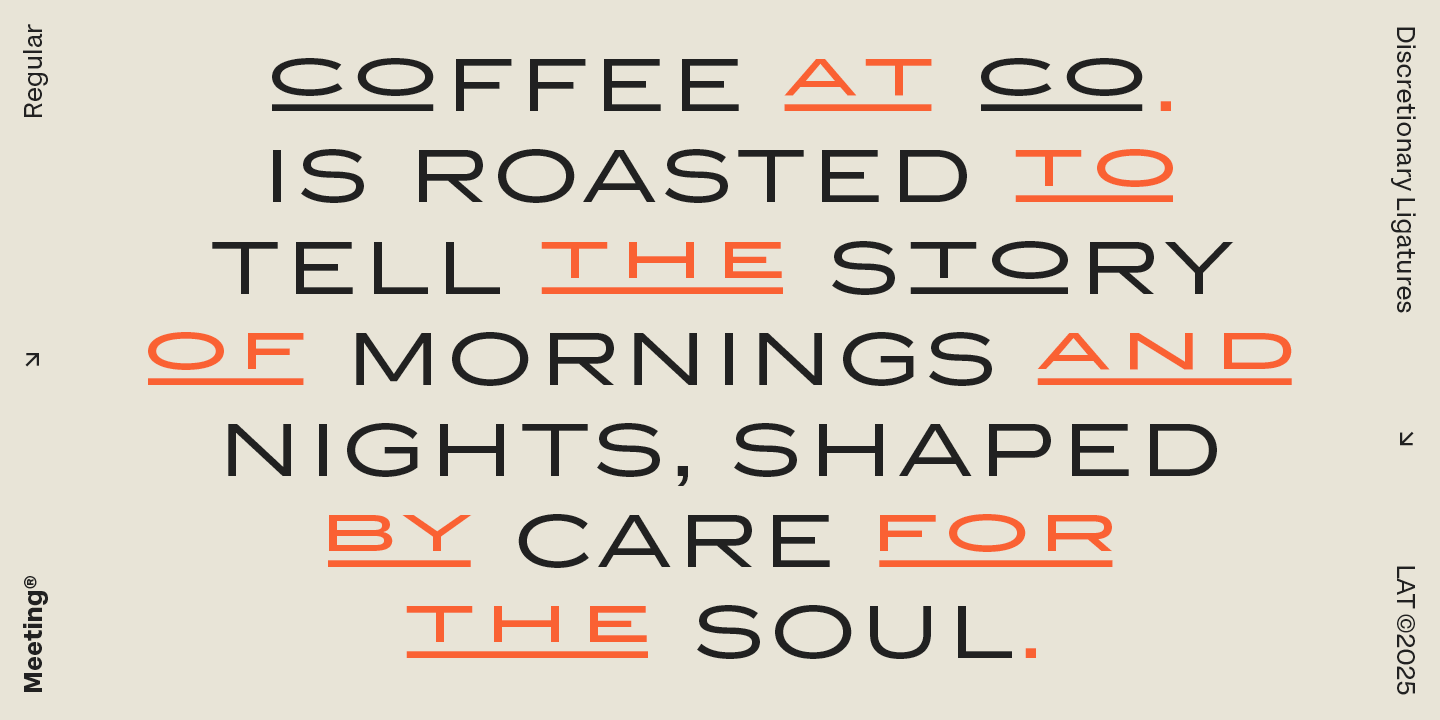 Meeting is a sans serif with wide capitals and firm proportions. It carries a contained elegance and a contemporary feel, inspired by the sobriety of Copperplate Gothic, reinterpreting its spirit with a more relaxed and modern approach. Its generous spacing gives each word room to breathe, achieving clear reading and balanced composition.